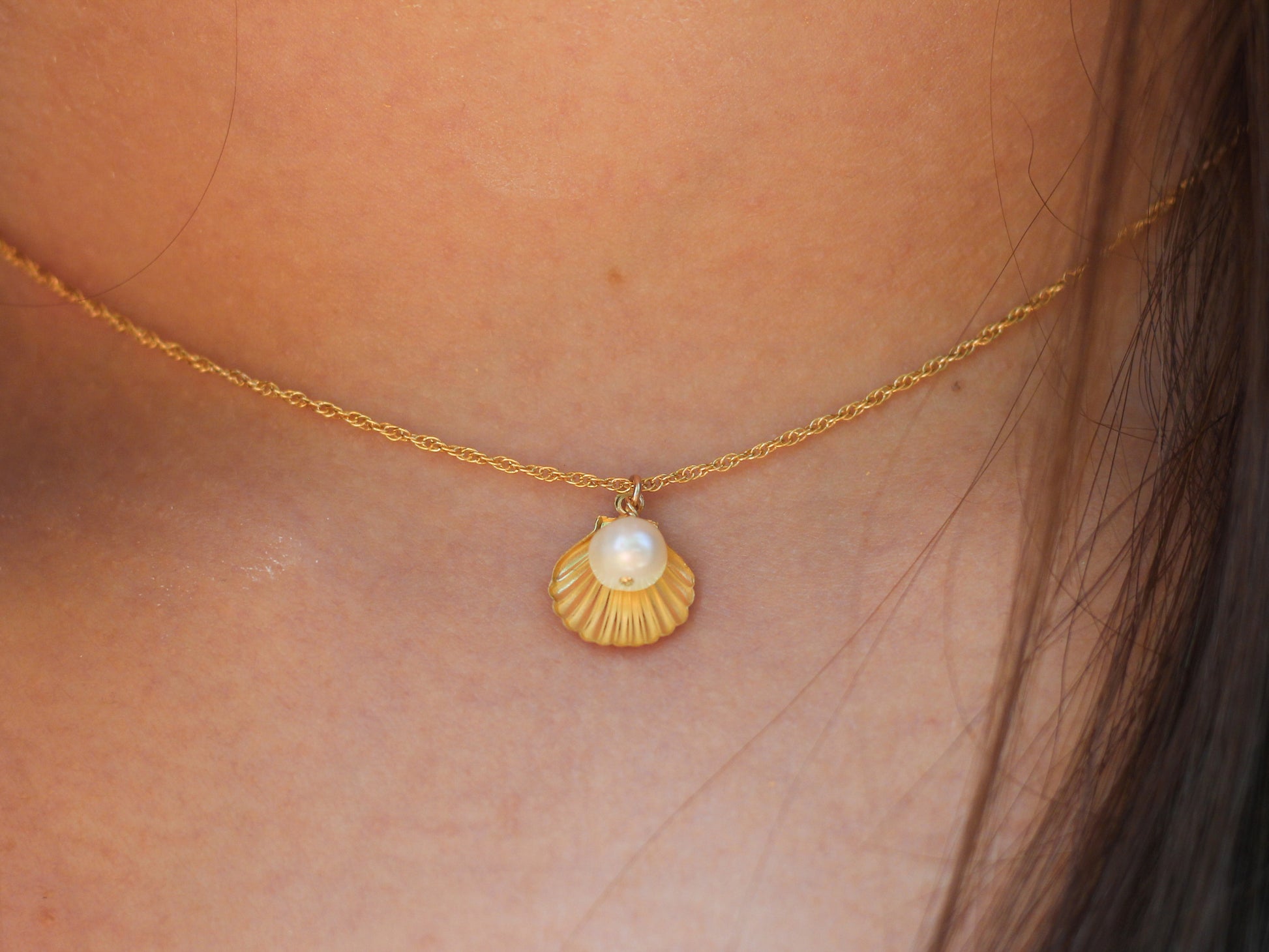 - Material: 14K Gold-Filled chain and findings, natural calico seashell, freshwater pearl