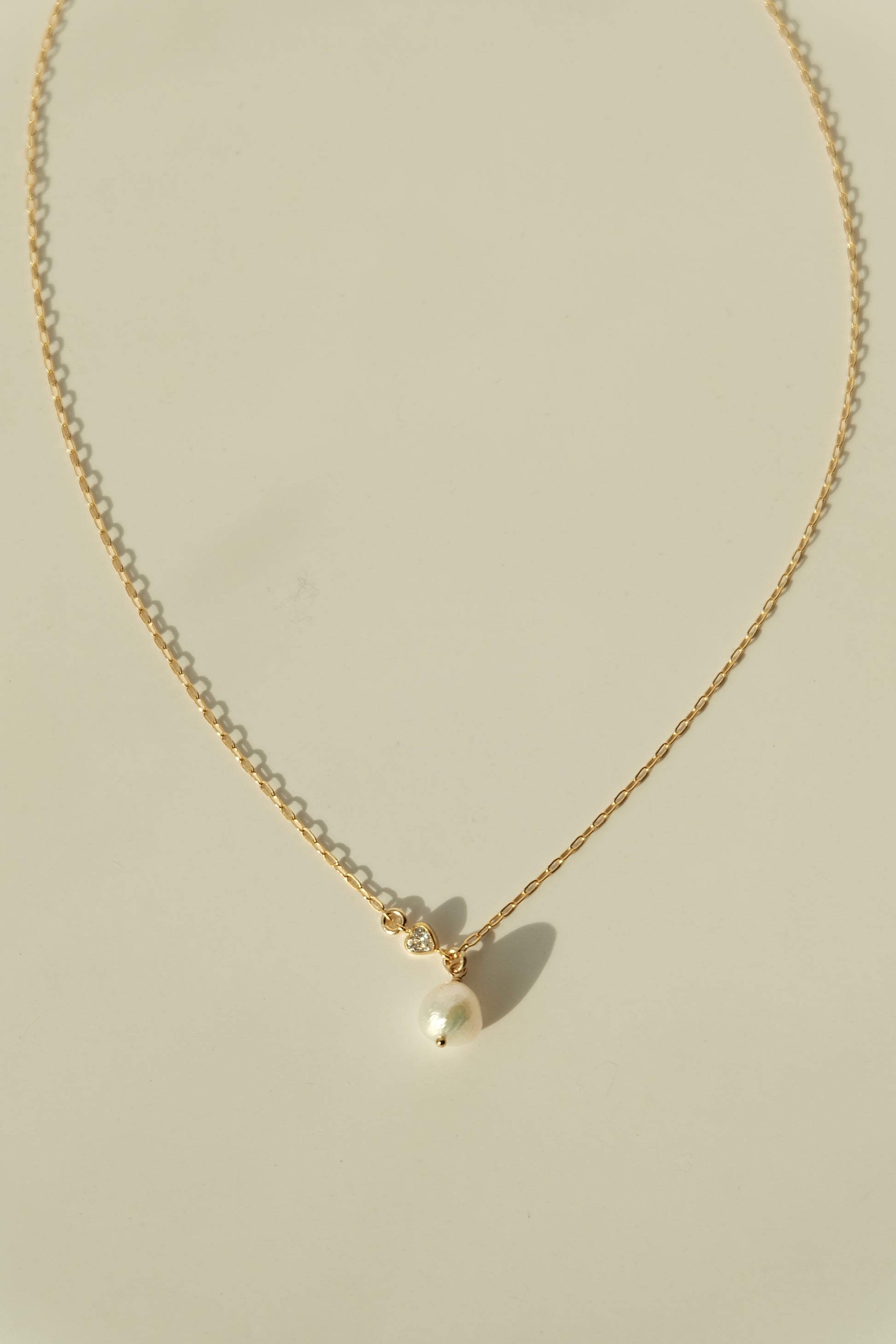 - Materials: 14K gold-filled chain and elements, heart-shaped charm, freshwater pearl