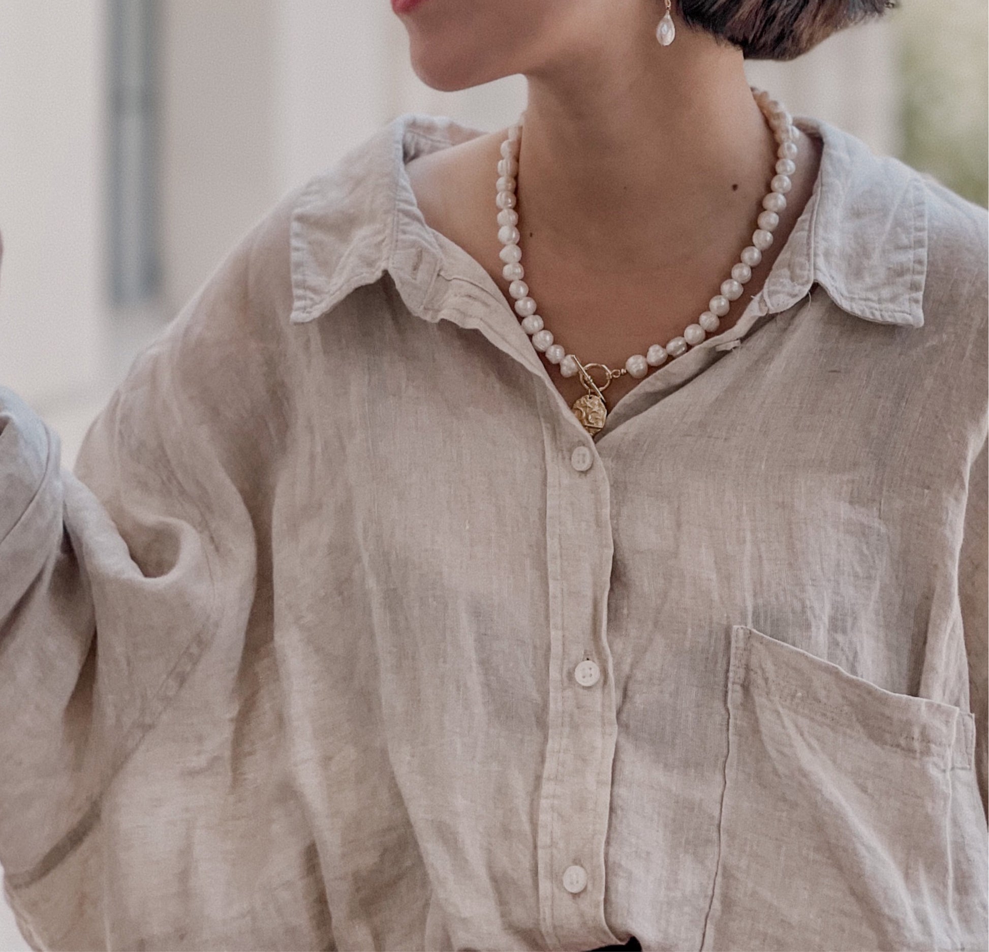 A celebration of artisanal craftsmanship and natural beauty, the Unique Creation Pearl Clasp Necklace features lustrous freshwater pearls delicately strung on 14K Gold-Filled chain, finished with a sculptural toggle clasp. This dainty yet distinctive piece captures the essence of modern femininity—radiant, refined, and effortlessly graceful. Each pearl tells a story of organic elegance, while the warm gold accents illuminate your neckline with understated luxury.